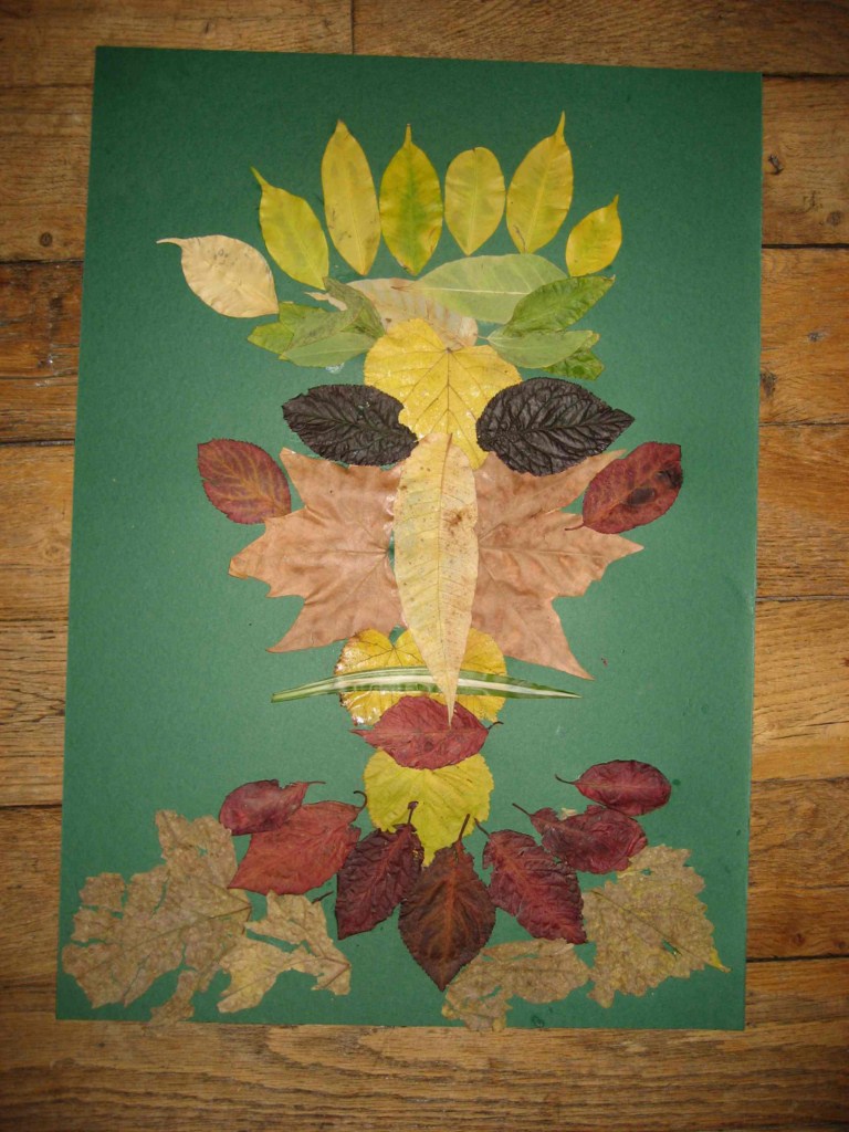 Personnages de face ou de profil réalisés ici avec un collage de feuilles d'automne.