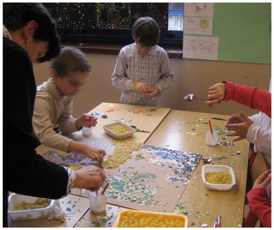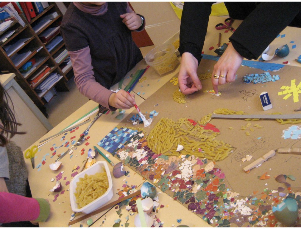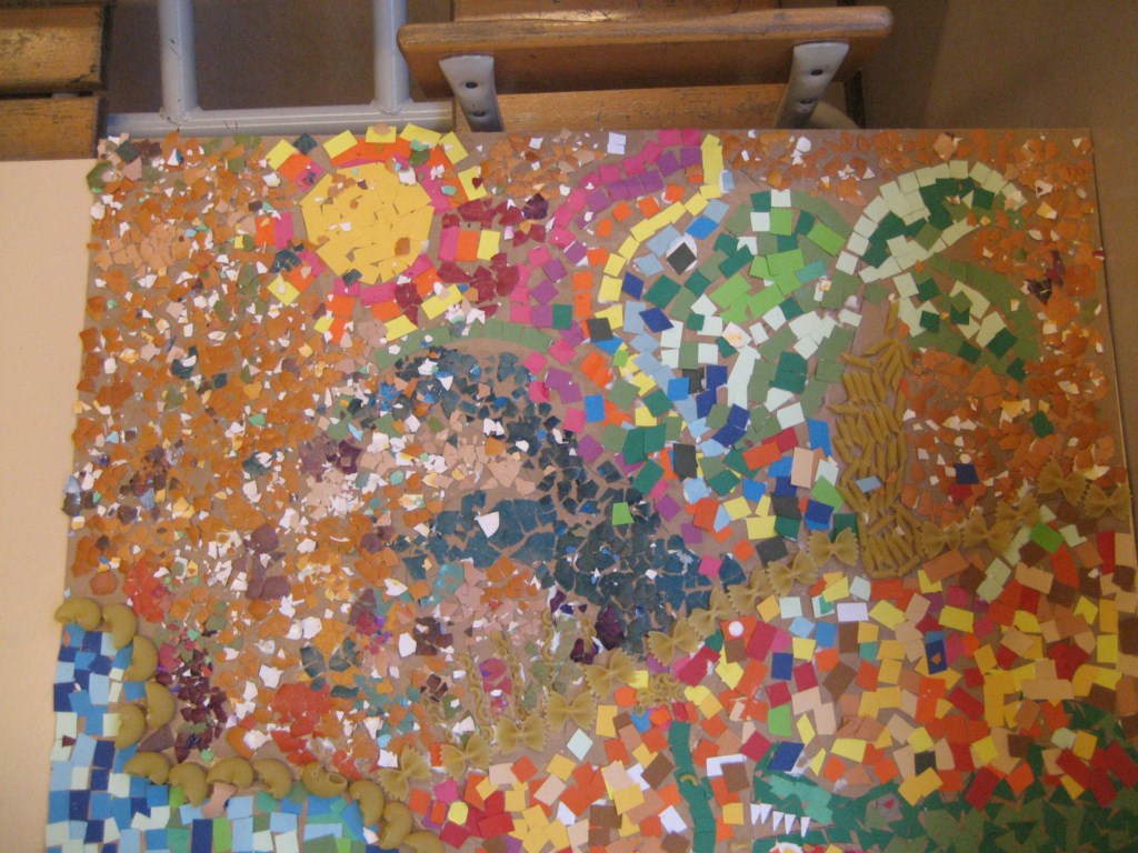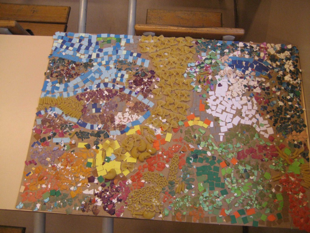 Différentes mosaïques :carrés réguliers de papier à la romaine,coquilles d’œufs, petits cailloux de couleur.