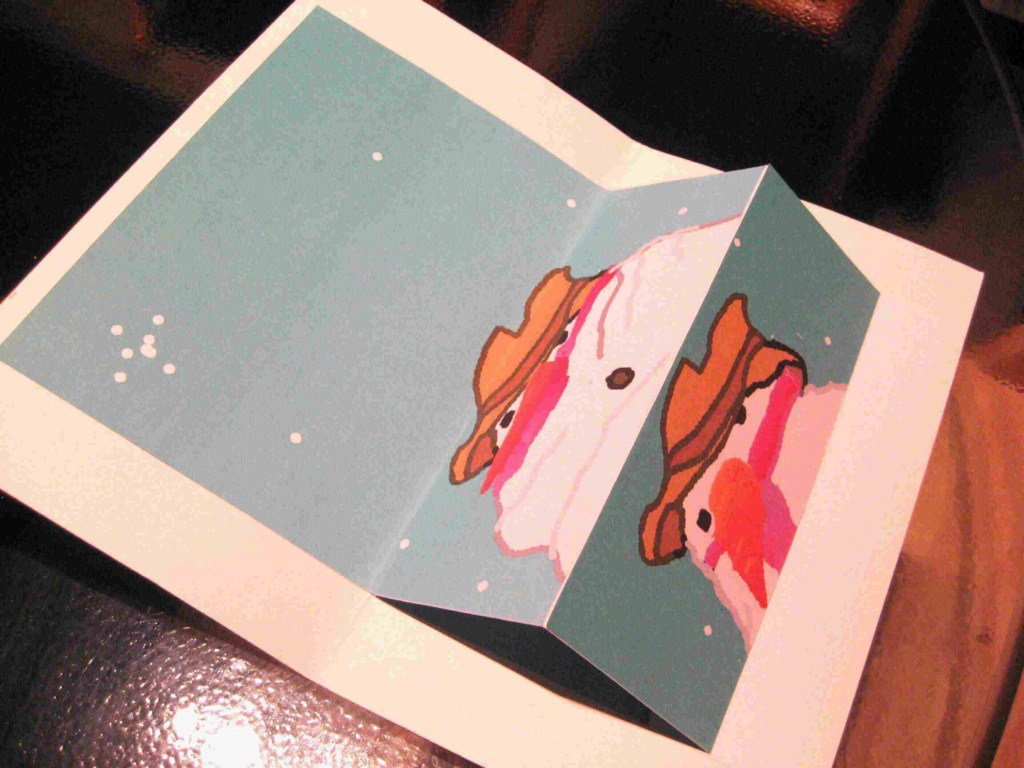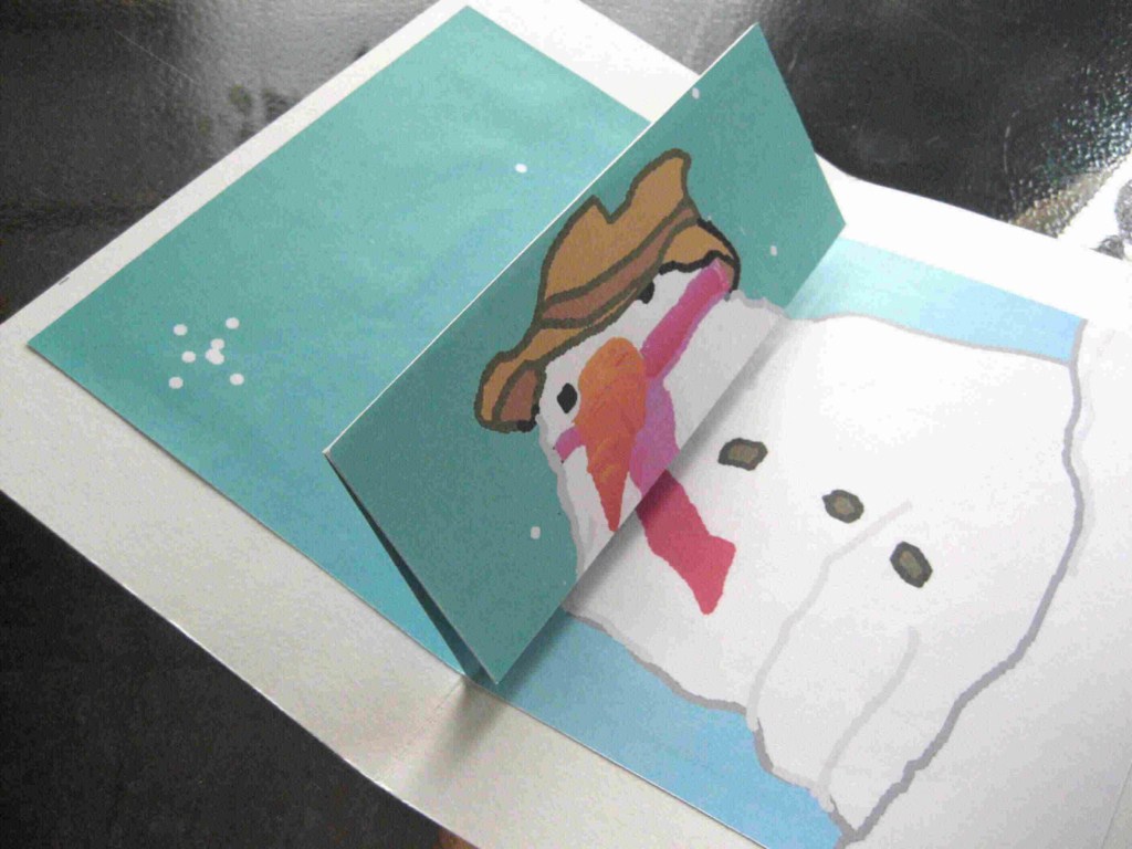 - moitié collée sur l'autre coté du support page et un quart du dessin sur l'arrière du bonhomme complet -