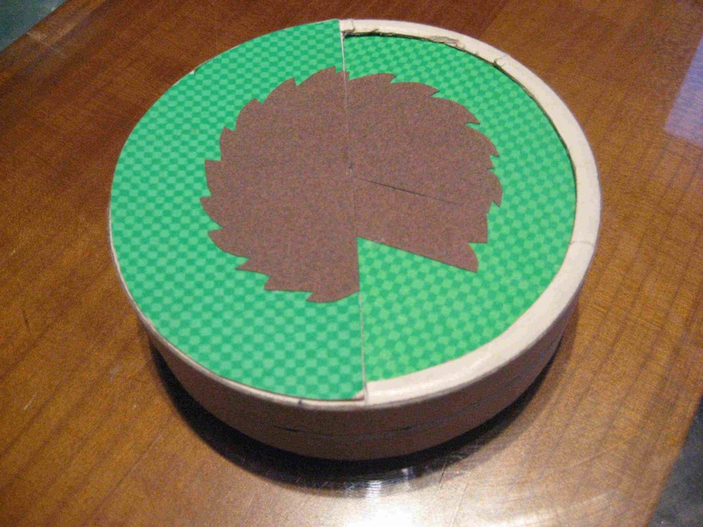 Coller un disque complet de papier sur le dessus de la boite inférieure et intérieure surlaquelle viendra s'emboiter la demie boite évidée.