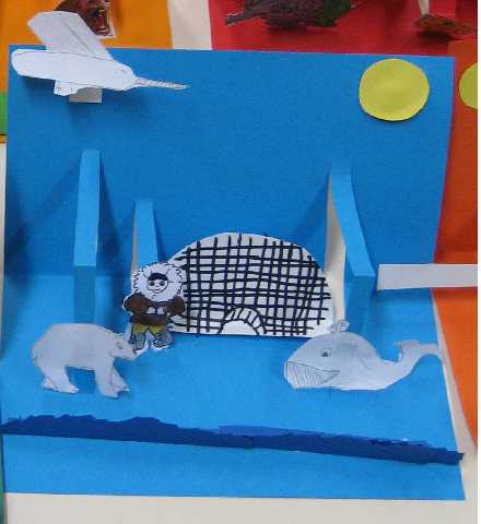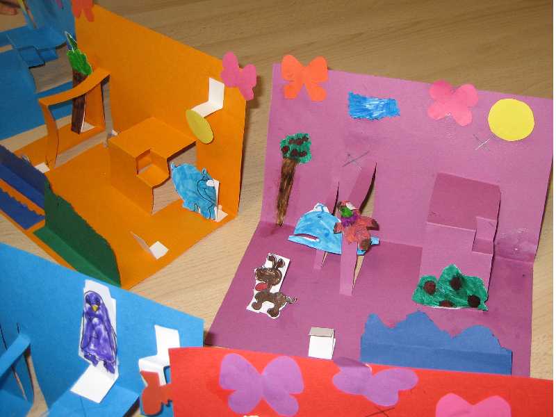 Depuis suite à une demande de la direction des centres de loisirs de la Mairie de Paris (DASCO)j'anime des ateliers pour les petits :les maternelles. Suivant les sections il faut plus ou moins les assister pour les découpages mais le volume les attire tous autant. Dans le courant d'année je change les thèmes et augmente la difficulté de réalisation .
