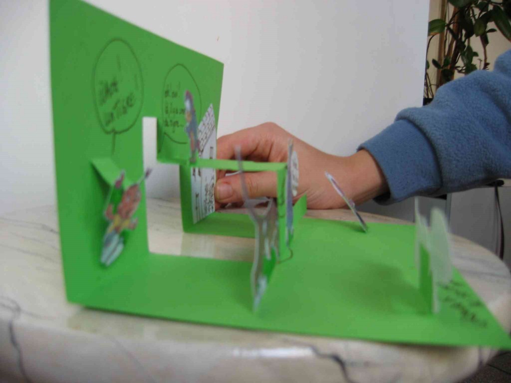 En pliant de façon tres tres basique deux feuilles reliées entre elles et collées; on peut animer simplement une mini histoire pour les enfants.