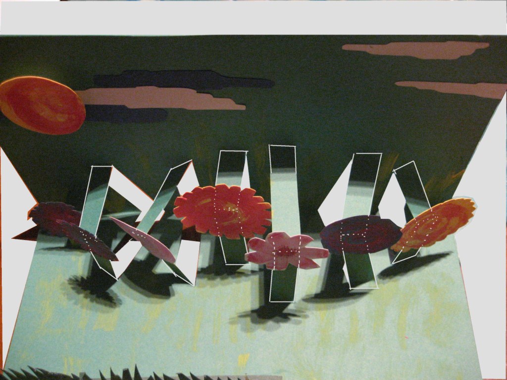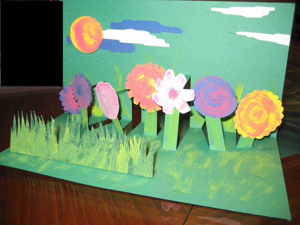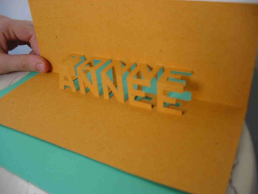 Autre réalisation avec les fentes découpées de base ;on déplace simplement les découpes en biais ,de longueurs différentes 2à 2 ou seulement sur une fente. en exemple une carte réalisée pour la fête des mères en 2008 en centre de loisirs avec des enfants de grande section de maternelle.