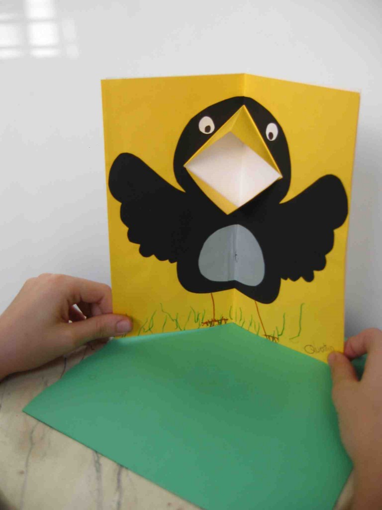 On peut aussi simplement réaliser des cartes pop-up .Ici un simple pliage inversé permet de passer le bec de notre corbeau en relief ...